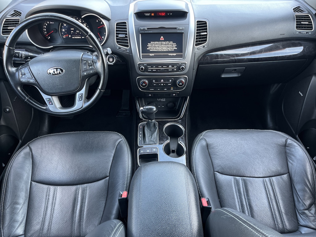 JUST ARRIVED!!! This 2015 Kia Sorento EX is a mid-size SUV that comes standard with a V6 engine, leather upholstery, power-adjustable heated front seats, and a 7-inch touch-screen display. It features all-wheel drive (AWD) on many models, a 6-speed automatic transmission, and a panoramic sunroof is often an included option or comes standard in some trims. The interior includes features like dual-zone climate control, a rearview camera, rear parking sensors, and a number of storage areas with media ports, power outlets, and cupholders. Safety features include side-curtain airbags, antilock brakes, stability control, and a UVO telematics system with collision notification and roadside assistance.